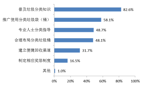 (二)有82.6%的受訪居民認為推行生活垃圾分類應采取的最主要措施是“普及垃圾分類知識”。